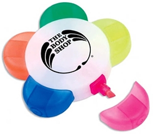Promotional flower highlighter. Flower shape 5-in-1 highlighter. White with Yellow, Pink, Blue, Orange and Green highlighters.